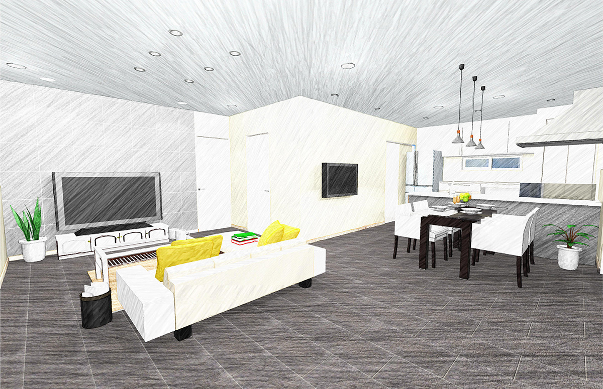 LDKにはフルフラットタイプのキッチンを設けてキッチン前の壁を無くし、間仕切り壁も極力無くすことで空間を最大限に活用。目線を遮るものがなく、視覚的にも広々とした開放感が得られます。