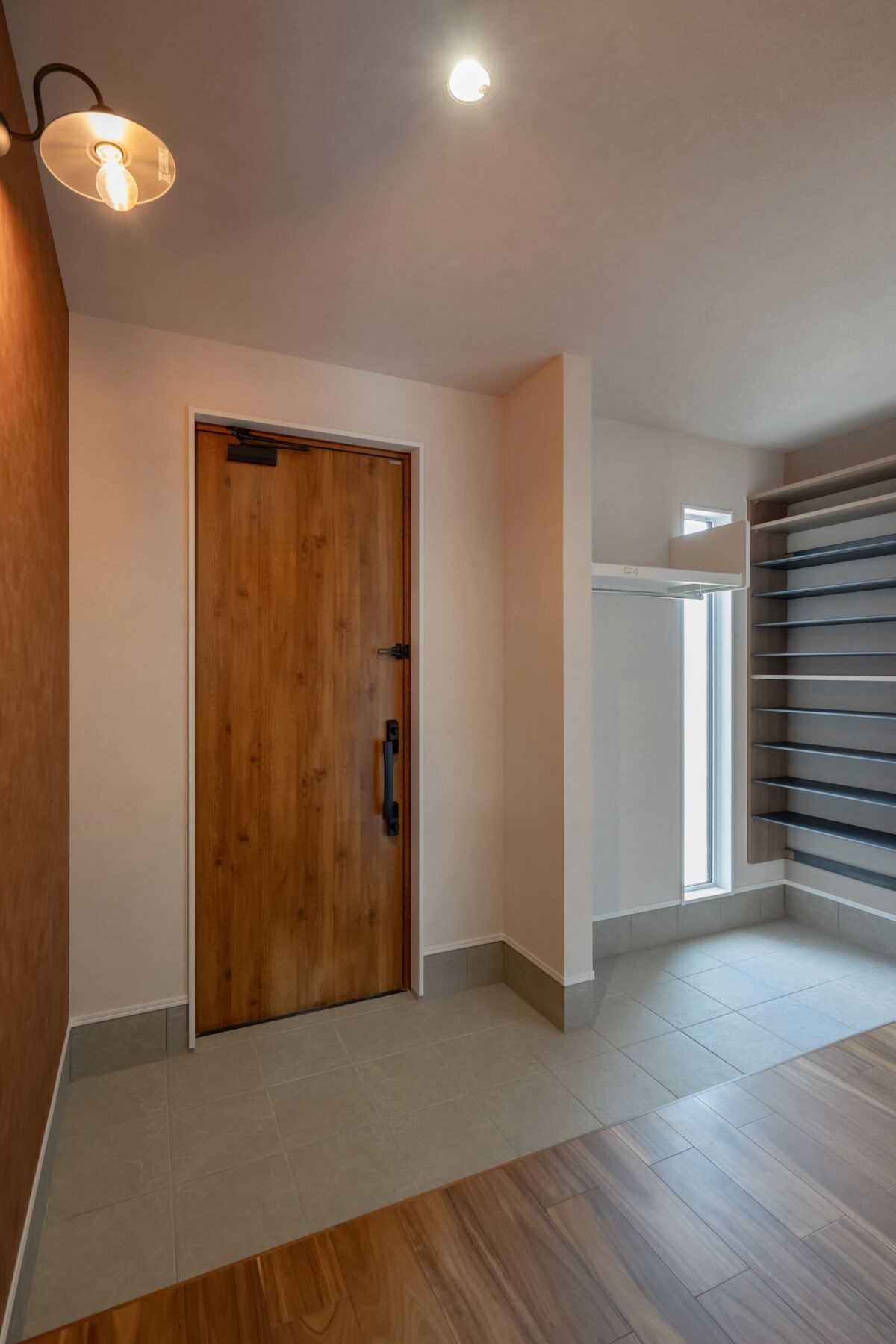 広々とした玄関スペースは、横幅にゆとりを持たせることで、家族一緒の外出や重い荷物の持ち込みもストレスフリーに。