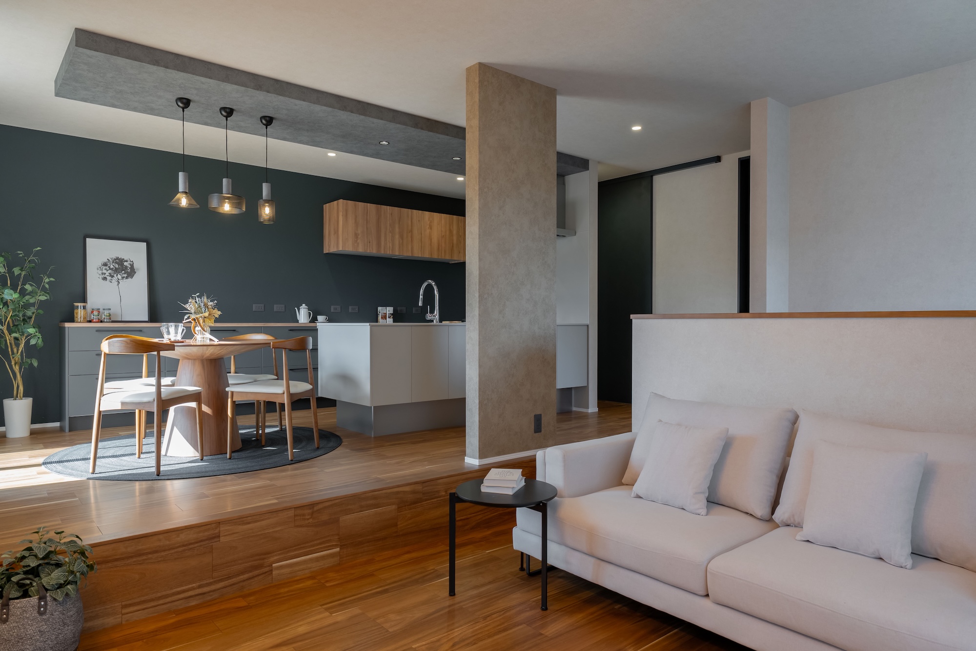 リビングには、床を1段下げたピットリビング(ダウンフロア)を採用。