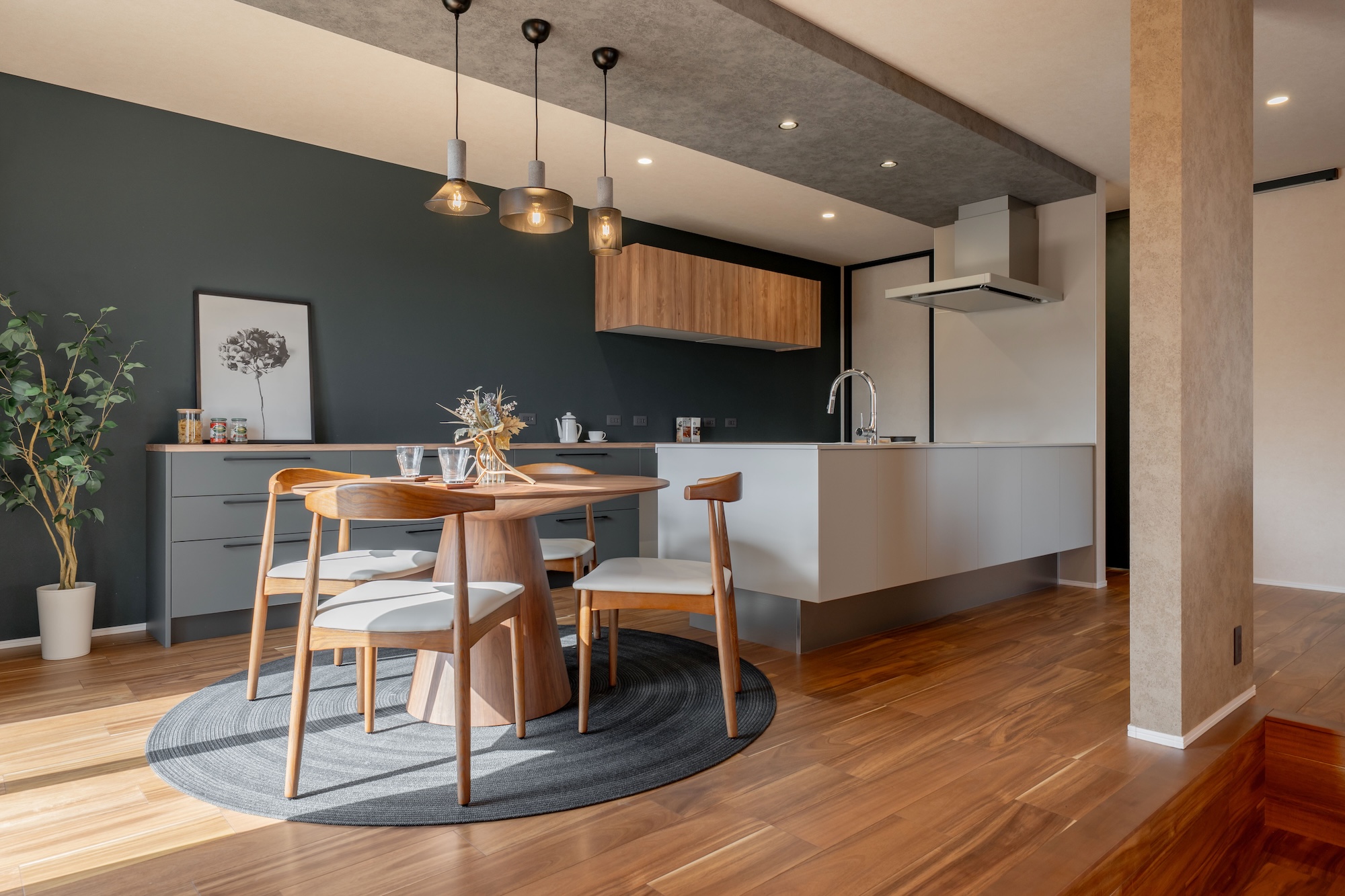 キッチンとダイニングを横並びにして、配膳や後片付けが横移動だけで完結する効率的な動線に。