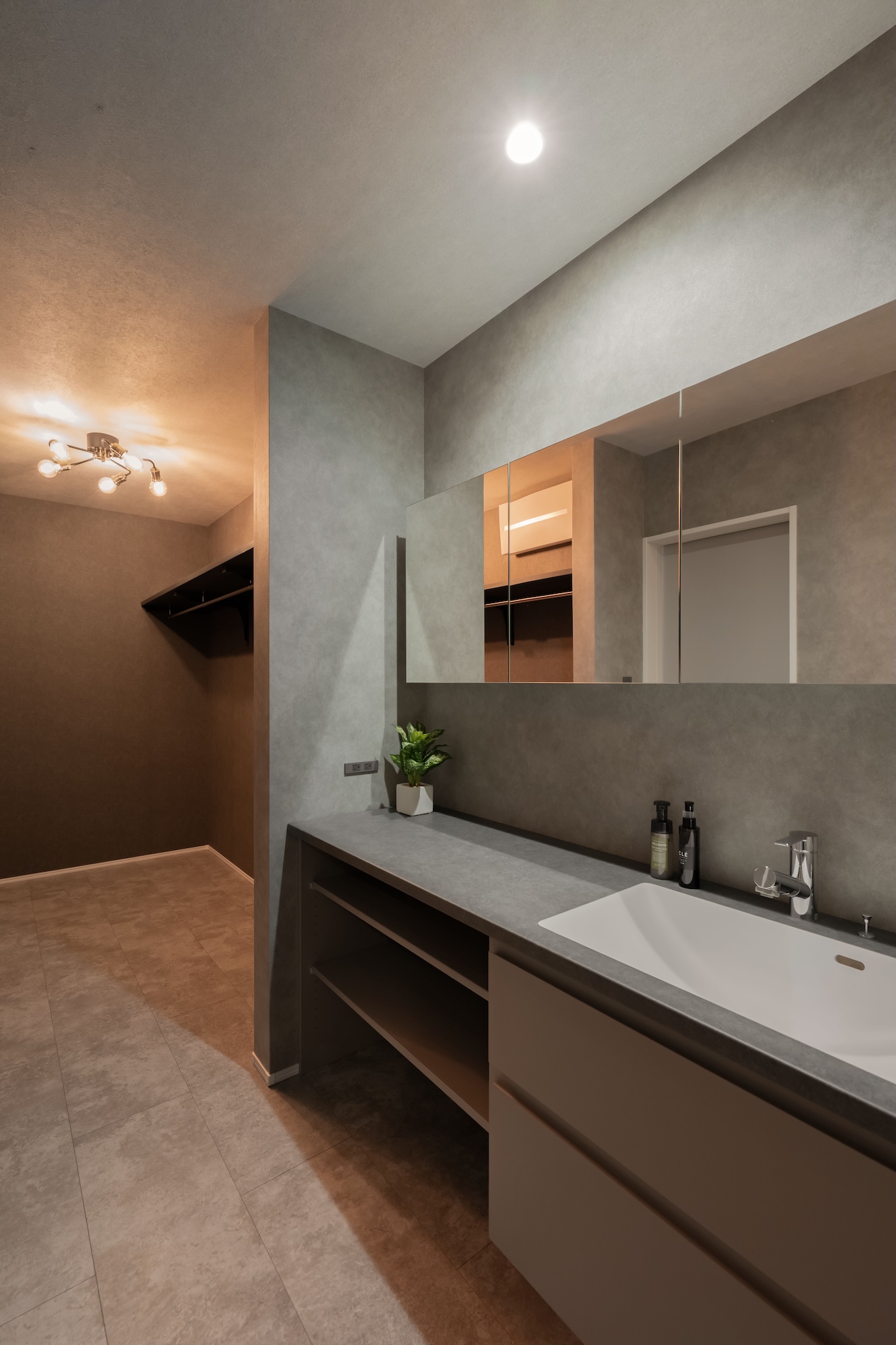 空間をグレーのグラデーションでまとめることで、毎日の家事時間が少し贅沢に感じられる洗練された雰囲気に仕上げています。