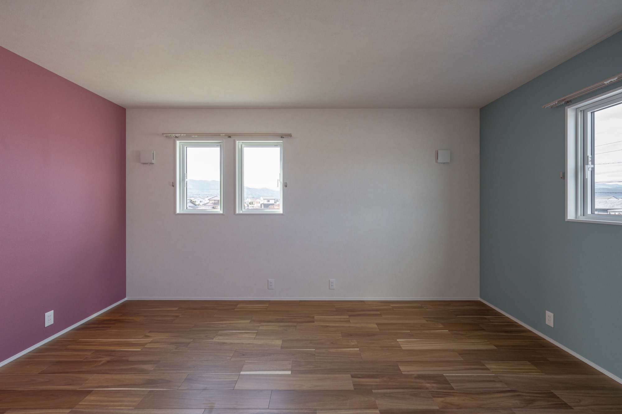 ピンクとブルーで左右に貼り分けた、遊び心あふれる9帖の洋室。