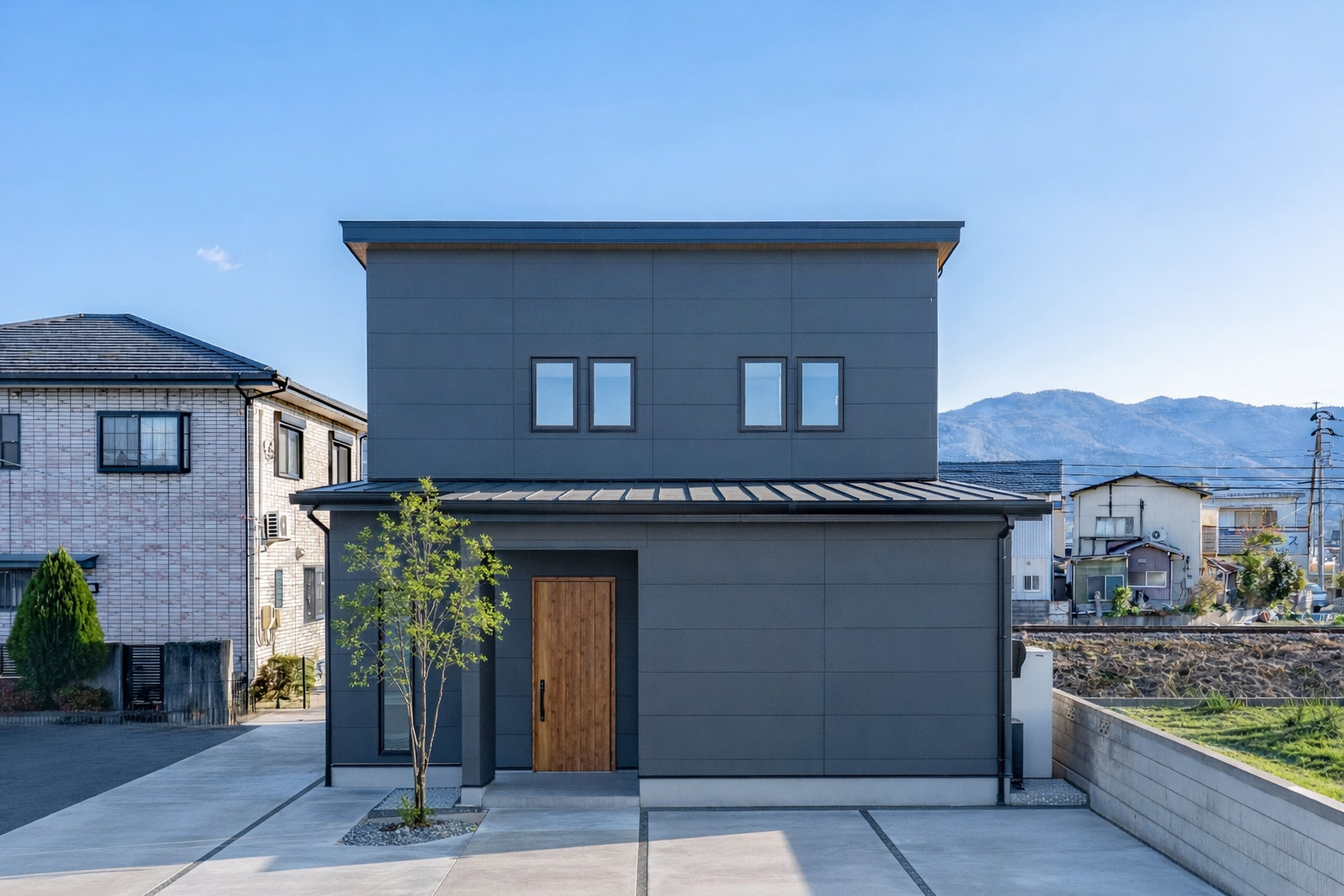 ブラックの外壁に木目のドアが映える、スタイリッシュな外観。