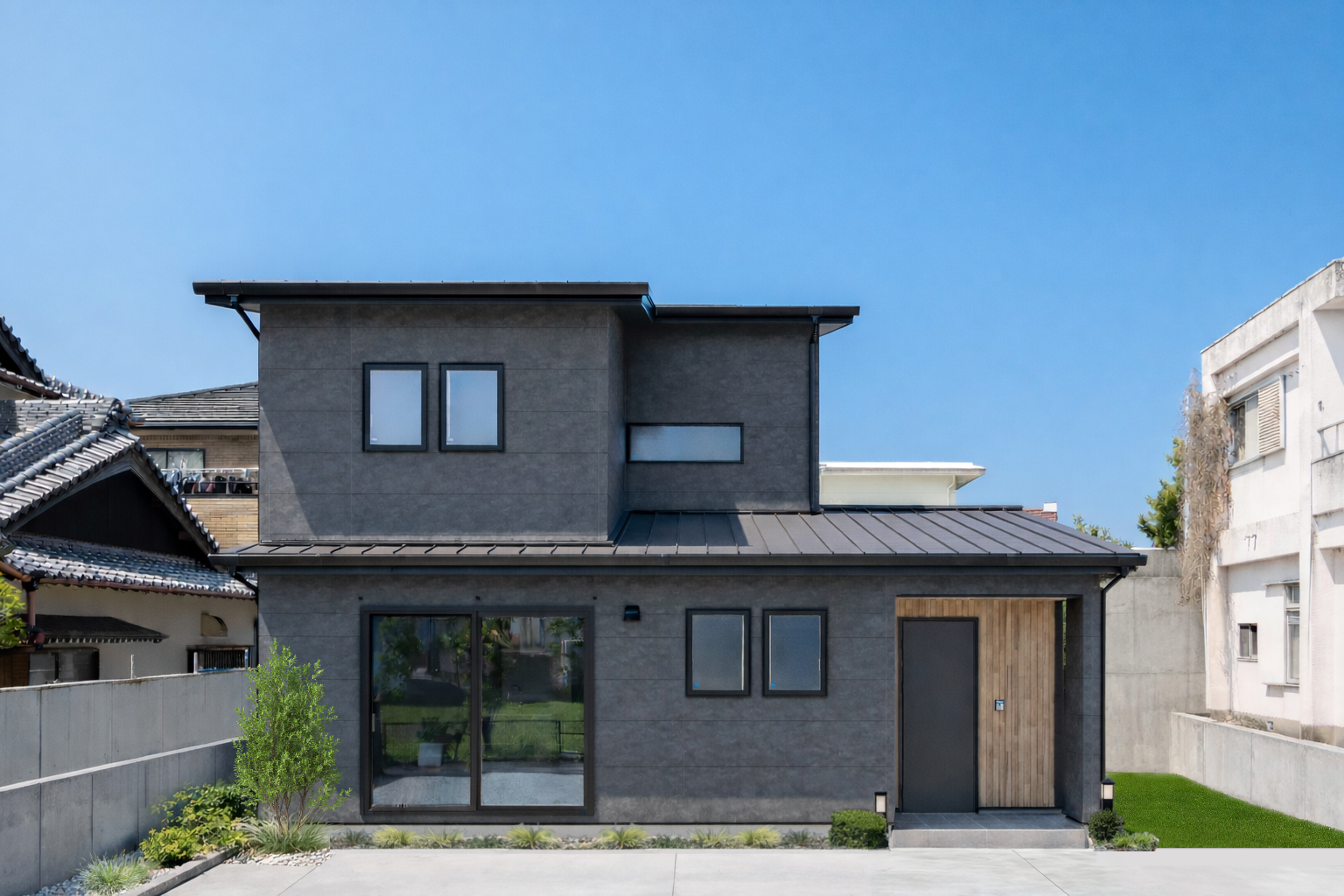 外観は、ダークグレーの外壁に黒いサッシを合わせた、シンプルモダンスタイルに。