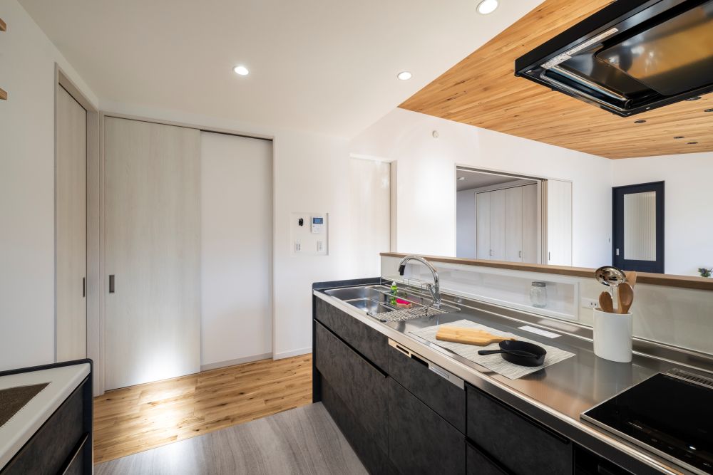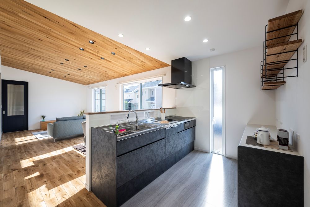▼リビング全体を見渡せる対面キッチン。腰壁で手元をさりげなく隠しつつ、背面は見せる収納で抜け感を演出。家事をしながら家族との会話が自然と生まれるキッチン。