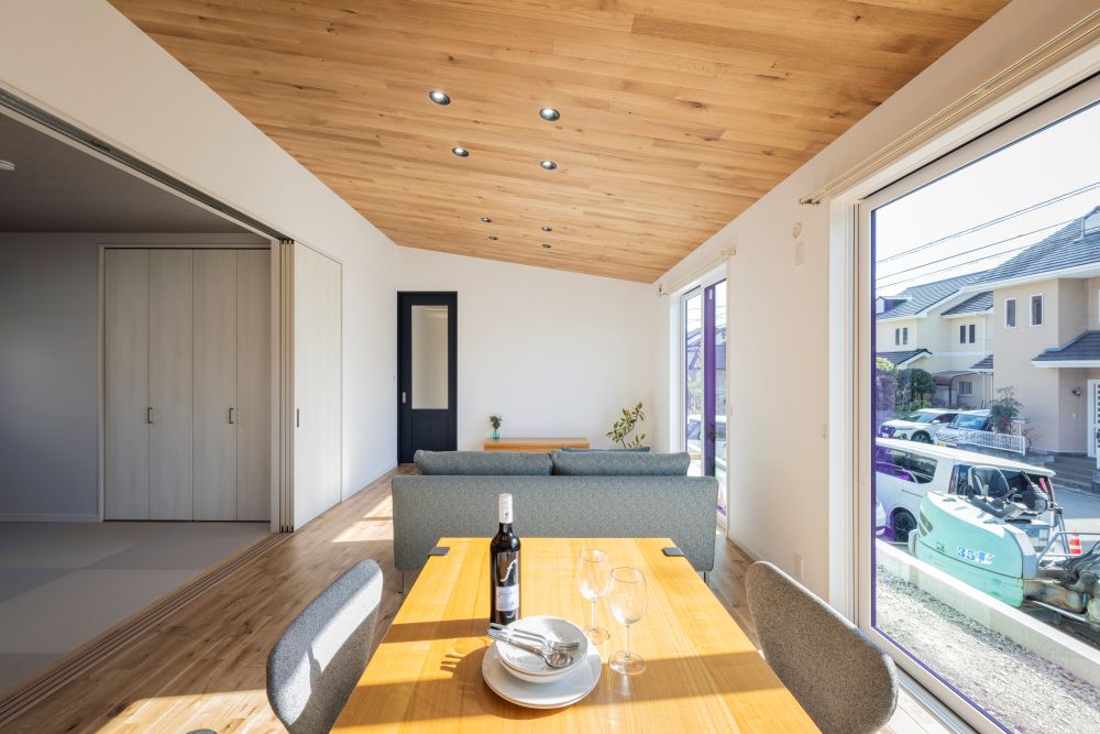 ▼木目の天井が空間全体に温かみを感じさせるLDK。大きな掃き出し窓から光をたっぷり取り込み、勾配天井になっていることで空間により広がりをもたせた。
