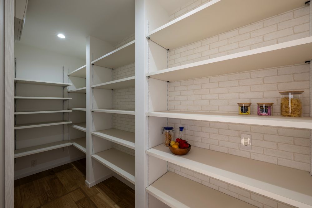 ▼キッチン裏に設けた大容量パントリー。可動棚を採用し、食品ストックや調理家電、日用品まで収納する物に合わせて高さを自由に調整できる。