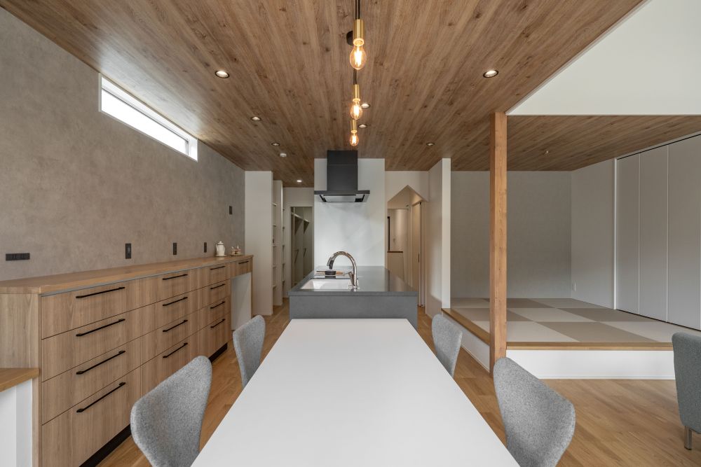 ▼家族が集まるLDKは23.8帖の大空間。平屋の屋根形状を活かした勾配天井が、より一層の広がりと開放感を演出。