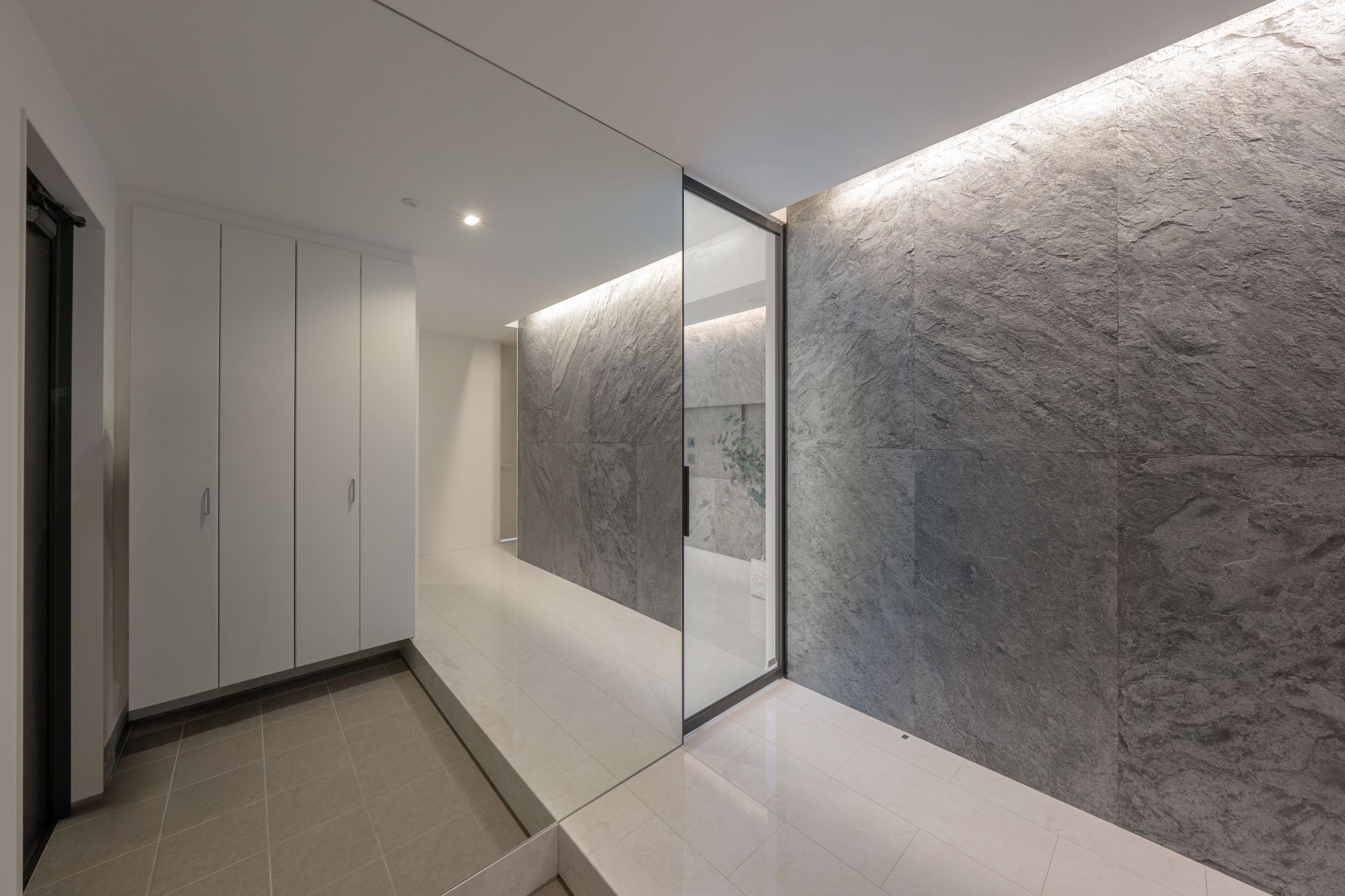 ▼玄関の壁一面に鏡を採用。実際よりも広く感じられるかつ高級感のある雰囲気に。
