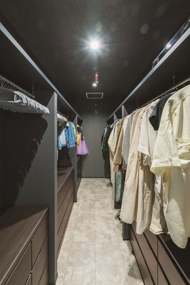 リビングと洗面室の2方向からアクセスできる、大容量のウォークインクローゼット。