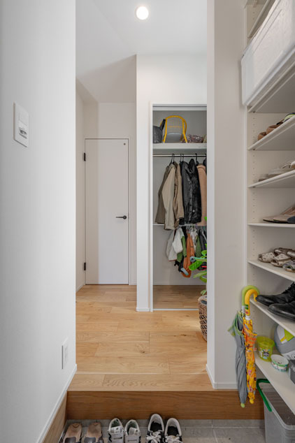 玄関入ってすぐのところに上着をかけるコートクロークを作っていて、かさばるコートなんかはそこに収納してます。