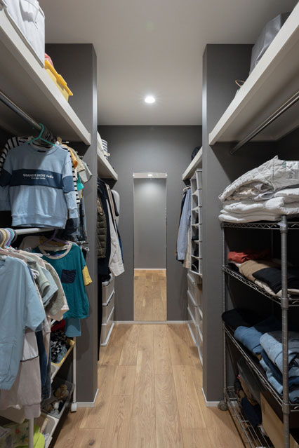 洗面所とランドリーの横にファミリークローゼットがあるんですけど、ここの動線がほんまに使いやすいんです。